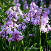 Een prachtig zacht paars rozige boshyacint. Groeit dicht bij de grond. De trossen klokjesvormige bloempjes staan op stevige
