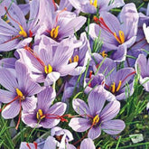 Krokus Sativus of Saffraankrokus komt niet in het wild voor, maar werd al in de oudheid geteeld voor de saffraan. Momenteel is Iran de grootste producent van saffraan met meer dan 90% van de totale wereldproductje. De planttijd is half augustus tot eind september en het bijzondere is dat eind oktober tot half november de krokus al in bloei komt. Een vrolijk geheel van violetkleurige bloembladeren met paarse aderen, drie helder gele meeldraden en drie bloedrode stampers. De stampers zijn lang en groeien zelfs over de bloem heen. Zij vormen de saffraan. Omdat onze bollen biologische geteeld worden, kunt u de stampers oogsten en drogen om te gebruiken in de keuken. Saffraan wordt gebruikt als aroma en kleurstof voor gebak, likeur, sauzen en rijstgerechten. Echte saffraan heeft een zeer aromatische smaak en geur en is zeer kostbaar.
